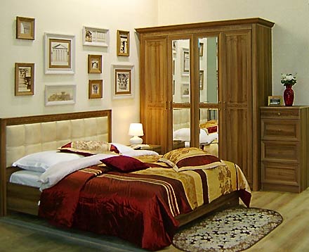 Мебель для спальни «Фламенко-2» - новинка 2011 года - изготавливается в двух оттенках персидского ореха. Его выразительная текстура придает классической модели современное звучание. Новый карниз из МДФ, ручки под состаренную бронзу и элегантный орнамент на фасадах, нанесенный по технологии шелкография, добавляют мебели респектабельности и изысканности. Высококачественная гипоаллергенная кожа, которой обтянуто изголовье кровати, обладает всеми свойствами натурального аналога: она мягкая и приятная на ощупь, устойчива к любому типу загрязнений, водонепроницаема и очень износоустойчива, что делает ее чрезвычайно удобной в эксплуатации. Серия для спальни включает в себя 10 предметов мебели.Декор: орех персидский светлый / орех персидский тёмный, рисунок (шелкография) Корпус: ДСП, пленка Фасады: МДФ рамочные с объемной вставкой, пленка, зеркало с фацетом Накладки: МДФ, пленка Способы обработки торцов: кромка ПВХ Фурнитура: ручки с искусственным старением «под бронзу» (пр-во Италия), петли, направляющие – роликовые (пр-во Россия) Основание кровати: ламели Размер спального места: 1,6х2 / 1,8х2 м