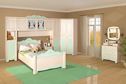 Детская «Парус» - новинка 2010 года! Это современная мебельная система с огромным выбором модулей: 2 вида кроватей - с ящиками и без, несколько вариантов шкафов, туалетный столик, комод, тумба, полка для книг, зеркало и очень популярный модуль типа «мост», в котором наряду с глухими имеются и стеклянные фасады с текстильными шторками. Использование итальянской фурнитуры в сочетании с фрезерованными декоративными накладками и карнизами в сумме с нестандартным дизайном самих накладок делают детскую мебель оригинальной и очень практичной в использовании. «Парус - Ассоль» – модель, разработанная специально для девочек – это сочетание нежного салатового цвета со спокойным светлым тоном корпуса и наличие модулей, без которых не обойдётся ни одна девочка. А ажурный цветочный орнамент на фасадах и декоративных накладках придают мебели утонченность и романтизм. Декор: дуб Паллада, салат матовый, рисунок Корпус: ДСП, пленка Фасады: МДФ рамочные с фрезерованной объёмной вставкой салатового цвета +фрезерованные накладки на спинку кровати Способ обработки торцов: кромка ПВХ, софт Фурнитура: керамические ручки Основание кроватей: ДСП Размеры спального места: 0,9х2 м; 1,2х2 м
