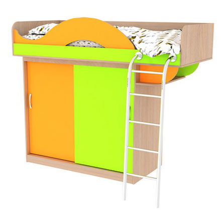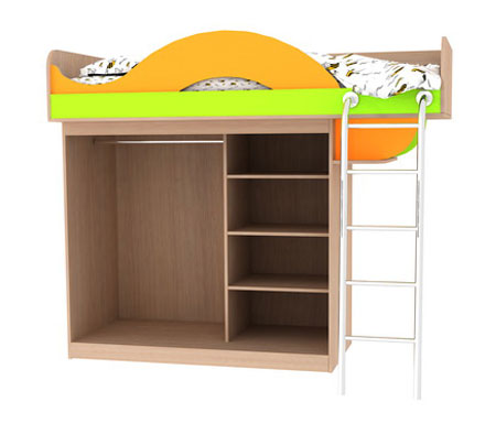 Детская кровать чердак Сити 4.4. Спальное место 80х190 см. Под спальным местом расположен шкаф-купе. Внутреннее пространство шкафа разделено на два отделения со штангой и полками. Лестница в комплекте.