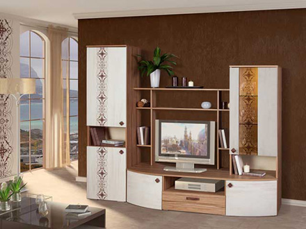 Горка «Элегия» - новинка 2011 года! Стеклянные полки подсвечиваются. Декоры: эбони светлый, кантри-стиль Корпус: ЛДСП Фасады: ЛДСП, МДФ, стекло Способ обработки торцов: кромка ПВХ Фурнитура: ручки под бронзу, ножки «хром матовый» (пр-во Россия), металлические роликовые направляющие (пр-во Россия) Размер ниши под ТВ: 800х670 мм.