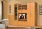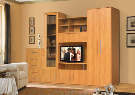 Полка под ТВ. Полка для аппаратуры. Отдел с откидной дверкой. Отдел для одежды с полкой. Три раздела за глухими дверками без полок. Комод с 5 ящиками для вещей. Отдел для посуды за прозрачной дверкой. Полки для мелочей.
