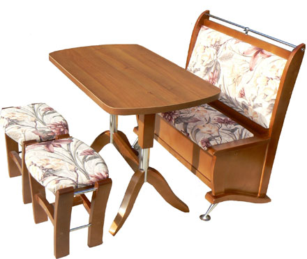Кухонный уголок «Юлия 9» – кухонный угол, похож на «Юлию 10»! Однако он отличается размерами стола и скамьи, а также в комплект входит дополнительный табурет. Идеально подходит для того, что бы собрать за столом в кухне большую семью или компанию друзей. Всем будет просторно и удобно! Ящик, который располагается под сиденьем, позволяет хранить много полезных кухонных вещей.