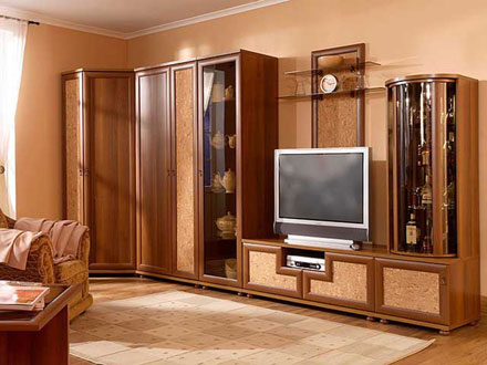 Добавьте к рациональным вместительным модулям немного чувства: Декоративную панель со стеклянными полками, Шкаф для посуды с вращающейся витриной и Ваша гостиная станет уютной и гостеприимной.