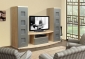 Полка под ТВ. Два раздела с полками за полупрозрачными открывающимися дверками. Один большой ящик. Полка для аппаратуры. Два глубоких отдела.