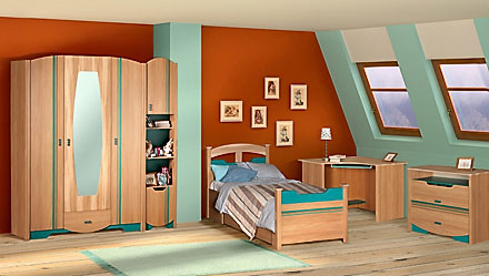 Мебель для детей и подростков «Оксфорд» - новинка 2011 года - создана с использованием элементов классического английского стиля. Сложная геометрия фасадов в сочетании с простотой модулей гармонично впишется в любое пространство: в маленький детский уголок и в большую комнату подростка. Яркий цветовой акцент бирюзового цвета подойдет как для комнаты мальчика, так и для комнаты девочки. Продуманная эргономика конструкций, современные материалы из последних коллекций немецких производителей декоров делает детскую мебель не только привлекательной внешне, но и удобной и экологически безопасной Серия детской мебели «Оксфорд» состоит из 16 отдельных модулей: различных шкафов, пеналов, тумб, столов прямого и углового и 2-х видов кроватей: одно- и двухъярусной. В модели использованы ручки от итальянских дизайнеров ведущих российских производителей фурнитуры. Мебель выполняется в комбинации декоров «орех африканский» и «бирюза». Декоры: орех африканский, бирюза, рисунок Корпус: ДСП, пленка Фасады: комбинированные ДСП/МДФ, прозрачное стекло, зеркало Накладки: декоративно-торцевые из МДФ в пленке Способ обработки торцов: кромка ПВХ Фурнитура: ручки металлические крашенные, петли, направляющие – роликовые (пр-во Россия) Основание кроватей: ламели Размеры спального места: 0,9х2 м