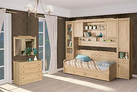 Детская мебель «Леон» – новинка 2012 г. – создана в классическом стиле с легким оттенком «ампир». В качестве декора использована немецкая пленка с 3D-эффектом, очень реалистично имитирующая текстуру дерева. Высококачественная гипоаллергенная кожа, которой обтянуто изголовье кровати и основание банкетки, обладает всеми свойствами натурального аналога: она мягкая и приятная на ощупь, устойчива к любому типу загрязнений, водонепроницаема и очень износоустойчива, что делает ее чрезвычайно удобной в эксплуатации. Ручки под состаренную бронзу (пр-ва Италии), классический орнамент на фасадах, нанесенный по технологии шелкография, а также гравировка на стеклах подчеркивают стиль и добавляют мебели изысканности. Серия включает 16 модулей: 3 вида кроватей – одно- и двухъярусных, 3 вида шкафов для одежды, шкафы, пеналы, полки, комод, тумбу и банкетку, внутри которой есть вместительный ящик для игрушек. • Декоры: акация мали / вяз, рисунок • Корпус: ДСП, пленка • Фасады: МДФ, прозрачное стекло с фацетом и гравировкой • Накладки: декоративно-торцевые из МДФ • Способ обработки торцов: кромка ПВХ • Фурнитура: ручки «под бронзу» (пр-во Италия), петли, направляющие – роликовые (пр-во Россия) • Основание кроватей: ламели • Размеры спального места: 0,9х2 м
