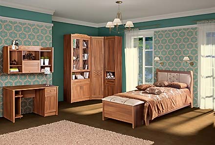 Детская мебель «Леон» – новинка 2012 г. – создана в классическом стиле с легким оттенком «ампир». В качестве декора использована немецкая пленка с 3D-эффектом, очень реалистично имитирующая текстуру дерева. Высококачественная гипоаллергенная кожа, которой обтянуто изголовье кровати и основание банкетки, обладает всеми свойствами натурального аналога: она мягкая и приятная на ощупь, устойчива к любому типу загрязнений, водонепроницаема и очень износоустойчива, что делает ее чрезвычайно удобной в эксплуатации. Ручки под состаренную бронзу (пр-ва Италии), классический орнамент на фасадах, нанесенный по технологии шелкография, а также гравировка на стеклах подчеркивают стиль и добавляют мебели изысканности. Серия включает 16 модулей: 3 вида кроватей – одно- и двухъярусных, 3 вида шкафов для одежды, шкафы, пеналы, полки, комод, тумбу и банкетку, внутри которой есть вместительный ящик для игрушек. • Декоры: акация мали / вяз, рисунок • Корпус: ДСП, пленка • Фасады: МДФ, прозрачное стекло с фацетом и гравировкой • Накладки: декоративно-торцевые из МДФ • Способ обработки торцов: кромка ПВХ • Фурнитура: ручки «под бронзу» (пр-во Италия), петли, направляющие – роликовые (пр-во Россия) • Основание кроватей: ламели • Размеры спального места: 0,9х2 м